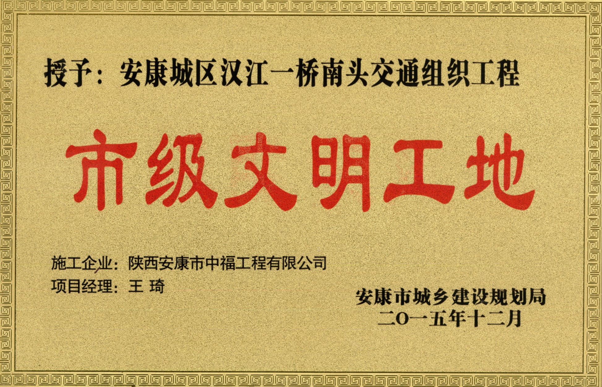 公司榮獲“安康市2015年度建...