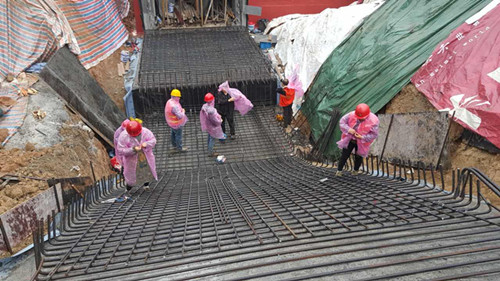 3月29日,春雨傾灑大地,低凹處積水成潭,給正在忙碌施工的中福公司香溪洞路口地下通道項目帶來了很大的影響,但在該項目地下通道踏步底板綁扎鋼筋和樁基施工的現場,工人們正在緊張有序的冒雨施工,現場一派熱火朝天的景象。